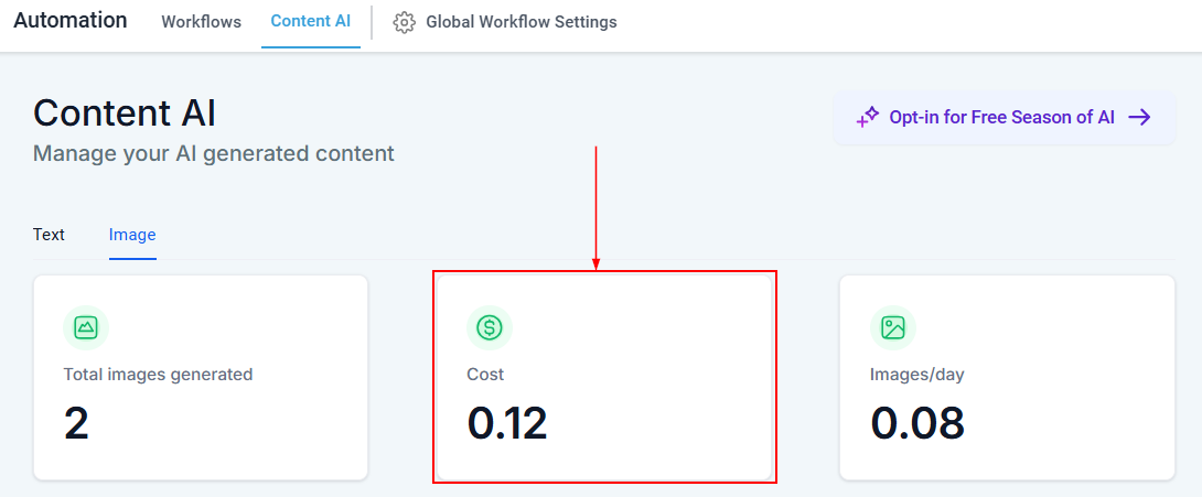 This dashboard shows you the total cost for all Content AI-generated images throughout your CRM.