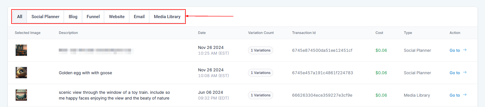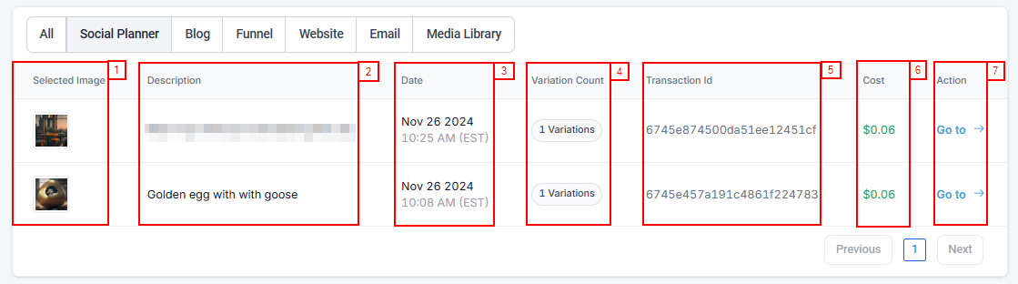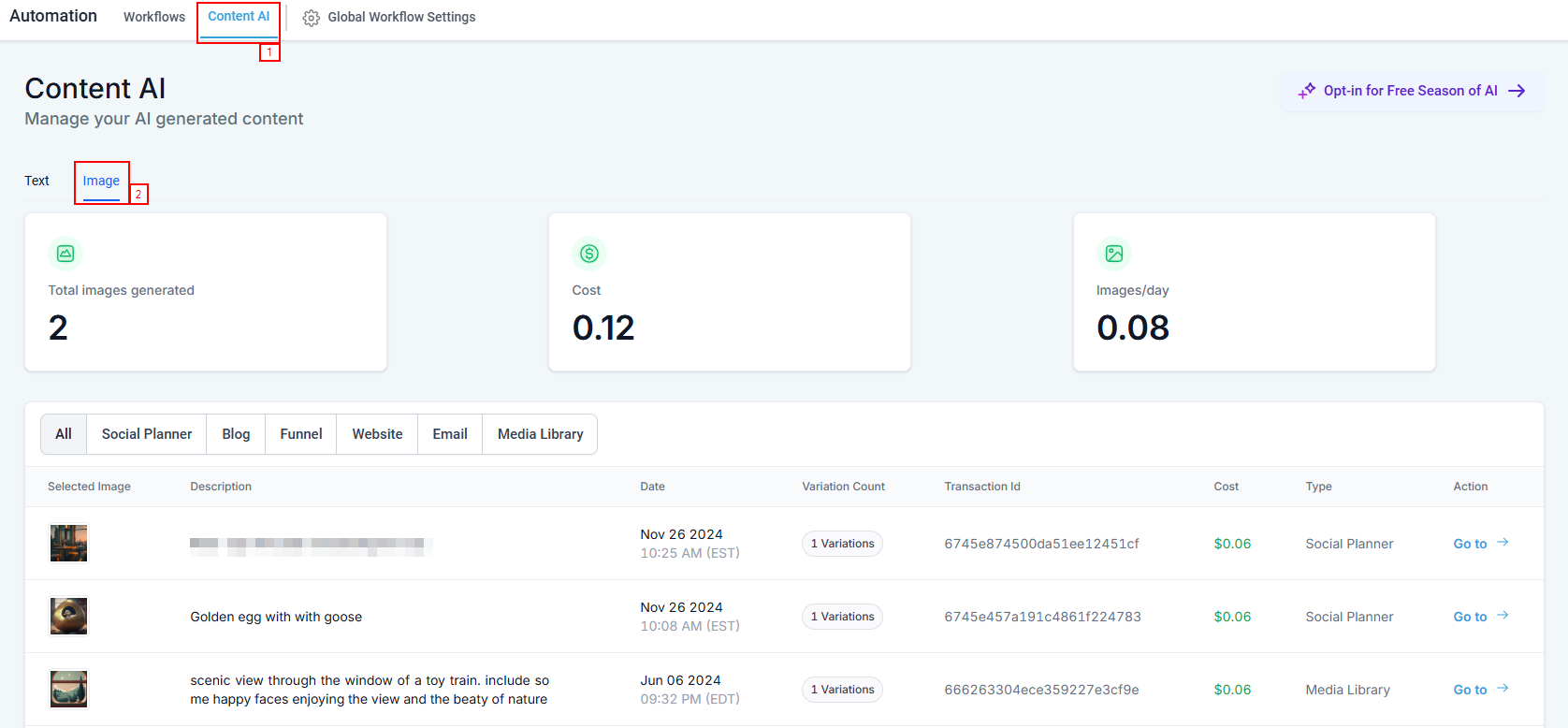 Transaction ID: This shows the transaction ID of each image generated by Content AI.