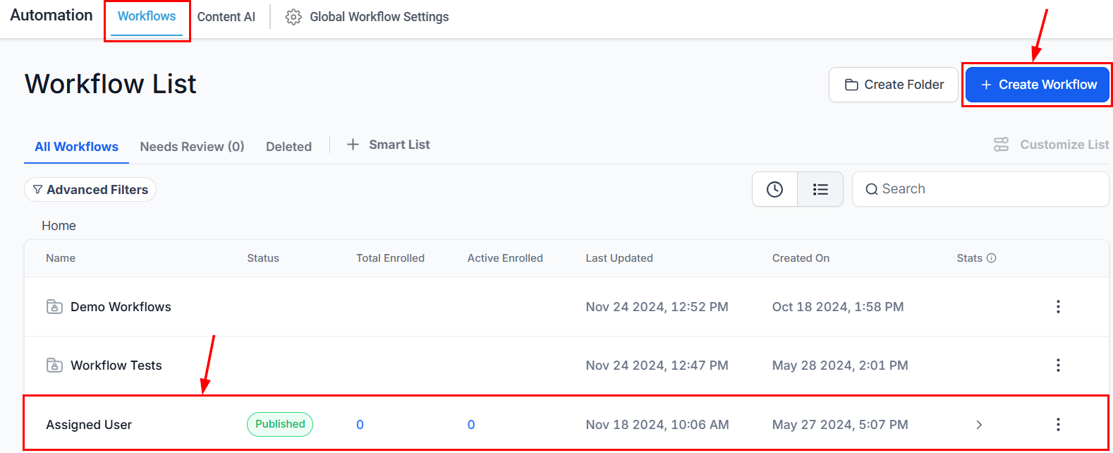 Navigate to the Automation > Workflows section in your account then select an existing workflow from the list, or opt to create a new workflow.