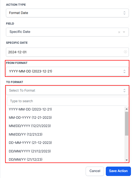For workflows involving both date and time, the formatter supports full reformatting. Select the field to modify, allow the feature to detect the current format, and select the desired format for better updates.