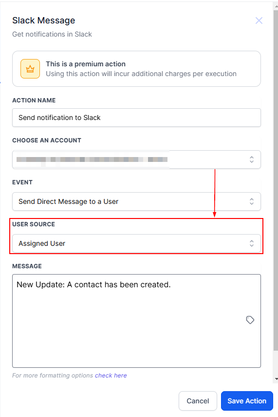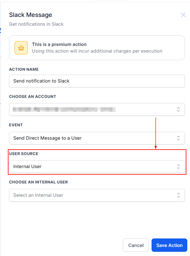 This option allows you to send messages directly to an account user. Itβs particularly useful for notifying specific individuals responsible for key areas of your business. For example, you can notify your finance head about a successfully closed deal. The system uses the selected Internal User's email to identify and message the corresponding Slack user.