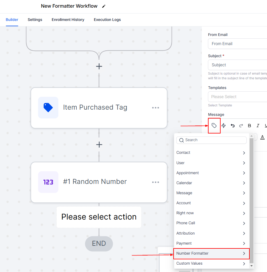 In the workflow, add a suitable Trigger, click the β+β icon, then in the actions menu, search for and add "Number Formatter" to the workflow.