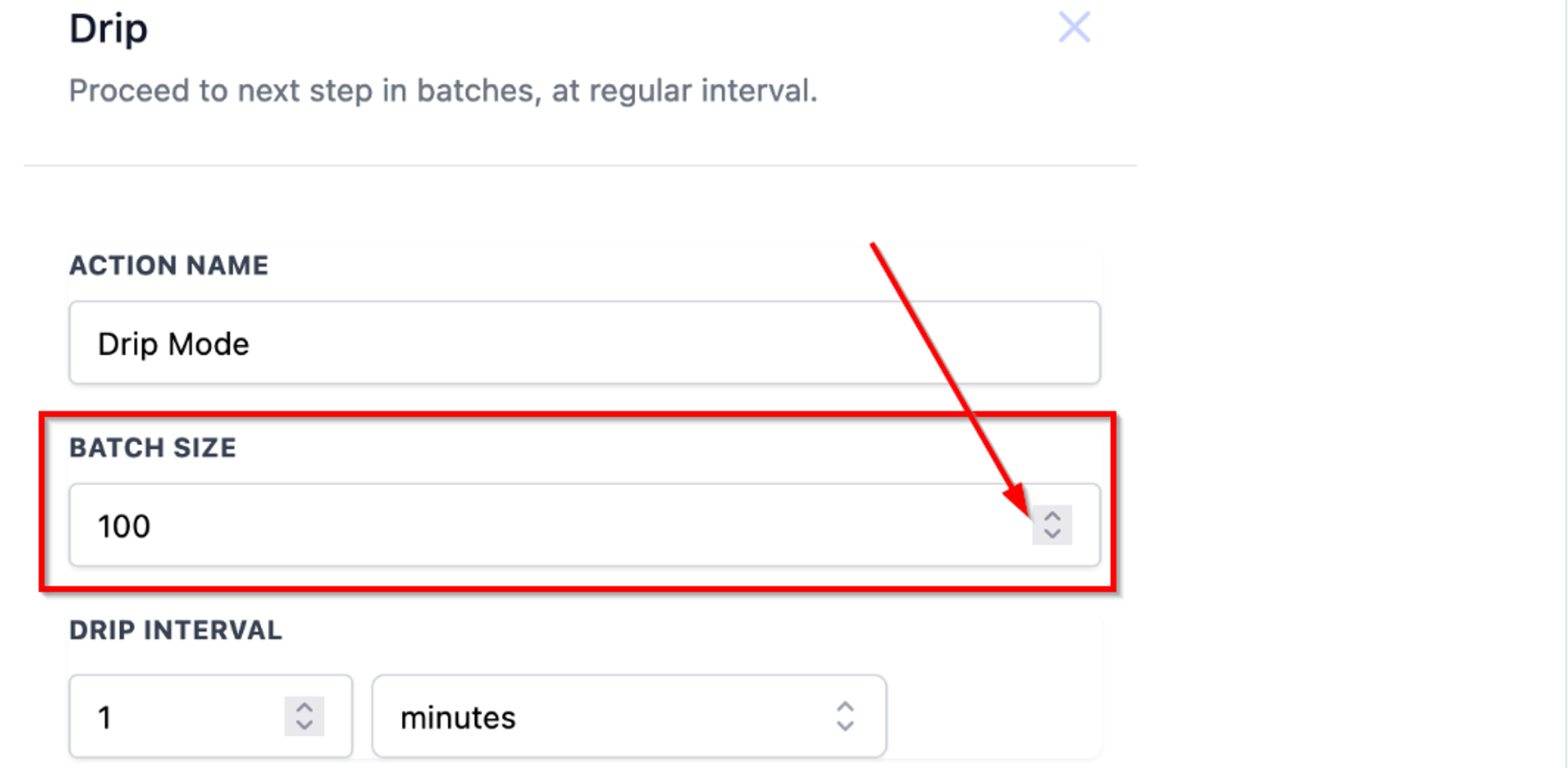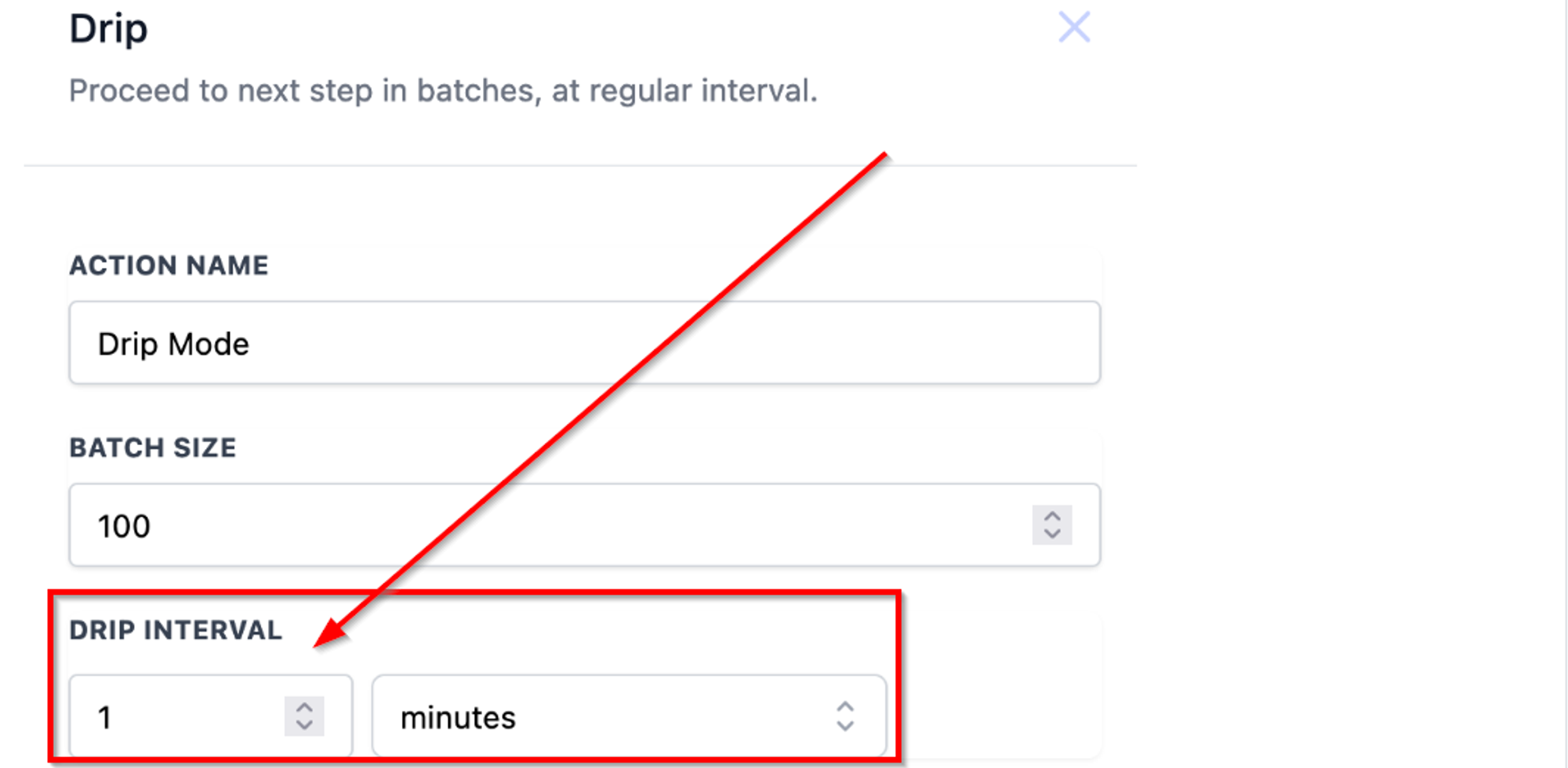 Set the time interval for the drip action. Choose between minutes, hours, or days ranging from one minute to seven days.