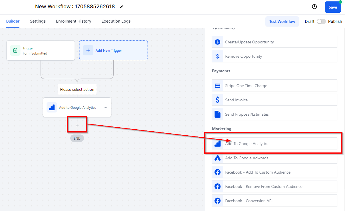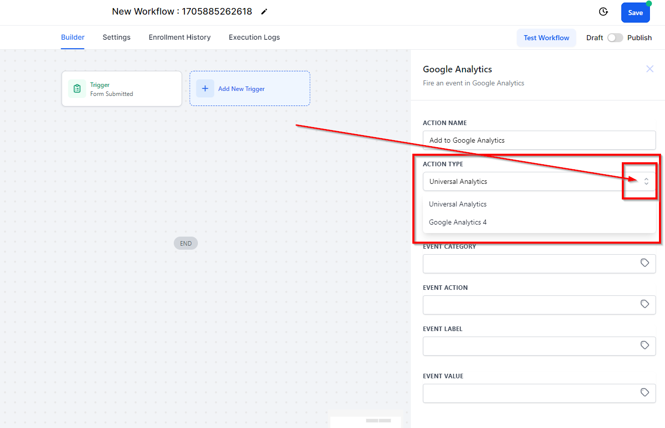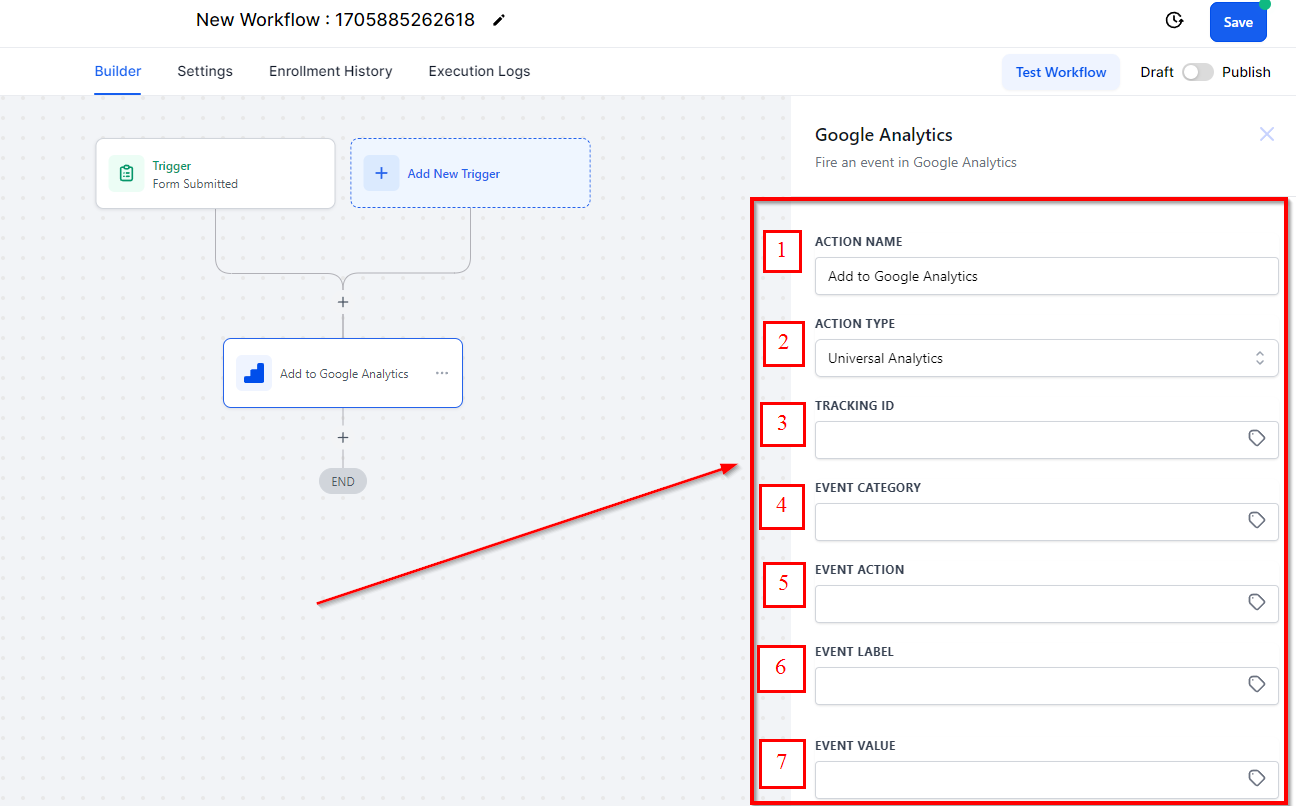 The Add to Google Analytics workflow action is utilized to trigger an event in Google Analytics. This event trigger requires users to input specific parameters within the workflow. This technique is ideal for when users want to track events beyond the user's page view or visit, such as form submissions, user opt-ins, or support calls.