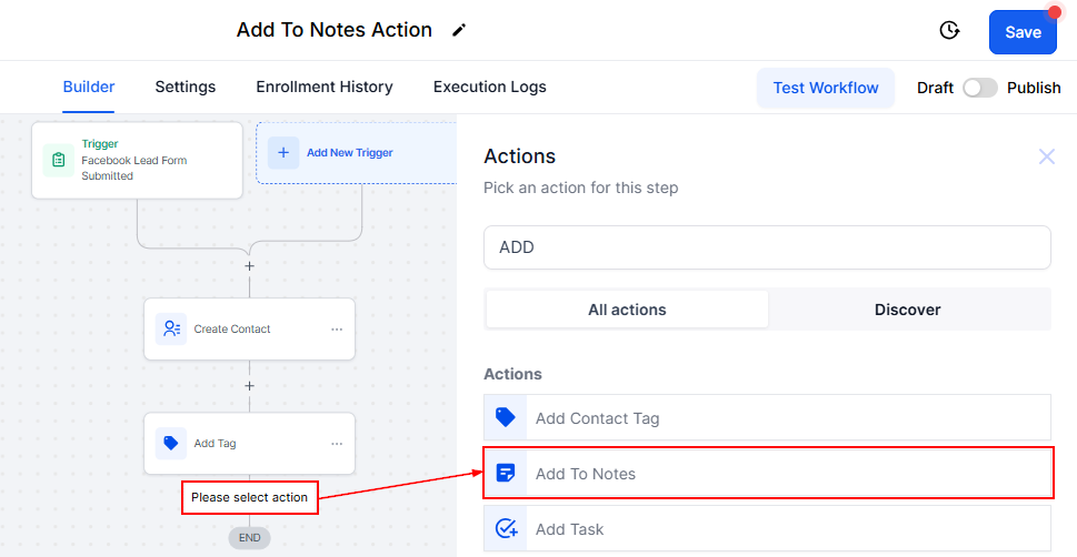 With the Add to Notes workflow action, you can add a note to the contact record. Use this workflow action to add notes to a contact record that can be shared with other assigned users to grasp information about content youβd like to share.