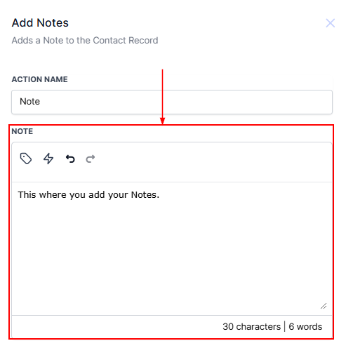 In the Add To Notes action, simply enter the Note in the designated field, which can be used to provide information that could be beneficial to other users assigned to that contact.