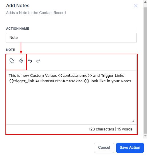 When adding notes, you can enhance them with Custom Values and Trigger Links. Click the tag icon to insert custom values like {{contact.name}} or {{user.email}}, which automatically pulls personalized details. Use the lightning bolt icon to add trigger links, such as {{trigger_link.AE3ghN6TYHJOI4dKBZ3}}, for embedding actionable links. These tools make your notes more detailed, specific, and functional for seamless collaboration.
