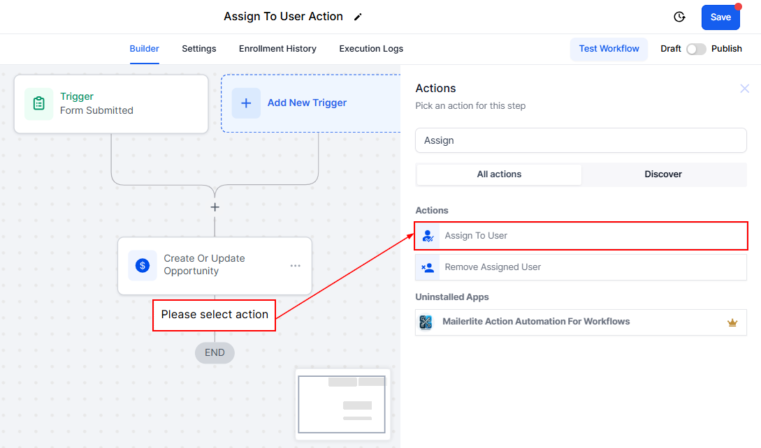 To get started, click on the β+β icon to add a new workflow action, and select Assign to User. Utilize this workflow action to assign the workflow or specific workflow actions to a team member or multiple team members for easy tracking.