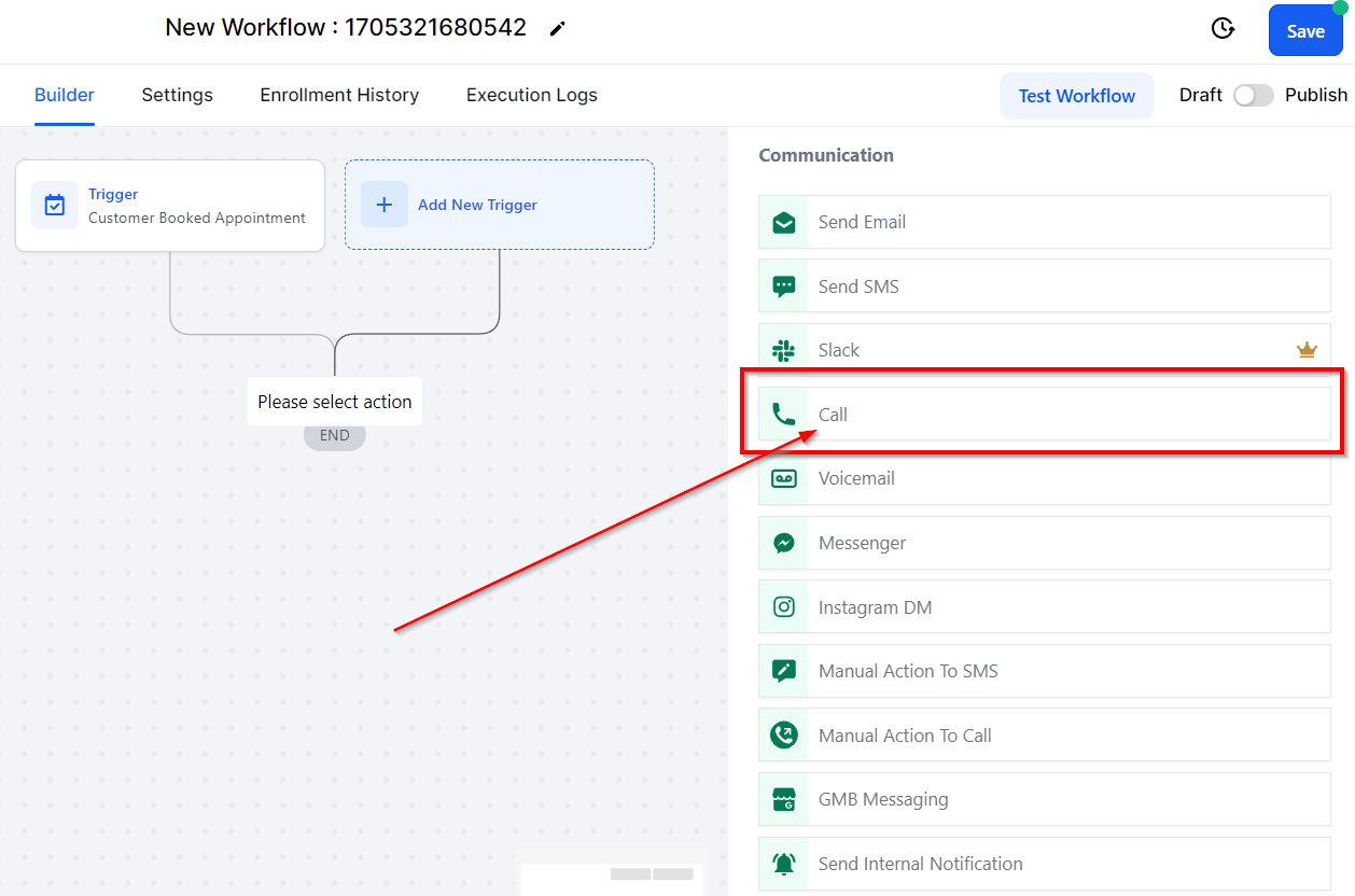 To get started, click on the + button to add a new workflow action, then select Call. You can change the name of the workflow action by typing in the Action Name field.