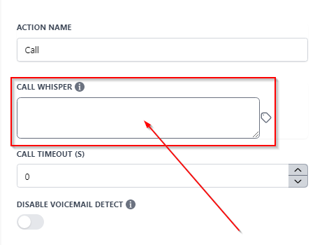 To select custom values to add to the call whisper, click on the tag icon located on the right side of the box and select the custom values you would like to add, such as contact name.