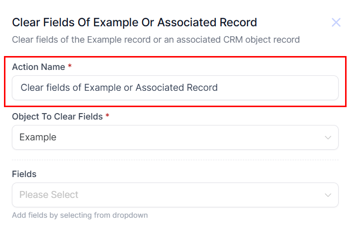 The Clear Fields of Object or Associated Record action enables you to clear temporary Notes and Internal Comment custom fields that are no longer required once the workflow trigger criteria are met. This functionality ensures that records are automatically updated, maintaining data accuracy and ensuring only relevant information is retained.