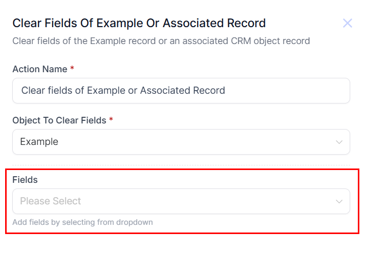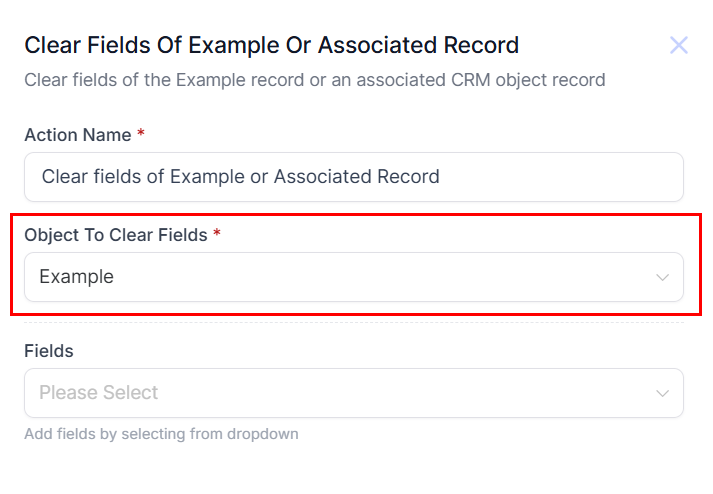 This field displays the records created in the Settings > Objects section of your account, allowing you to select the specific Object or Associated Record you wish to clear from the dropdown menu.