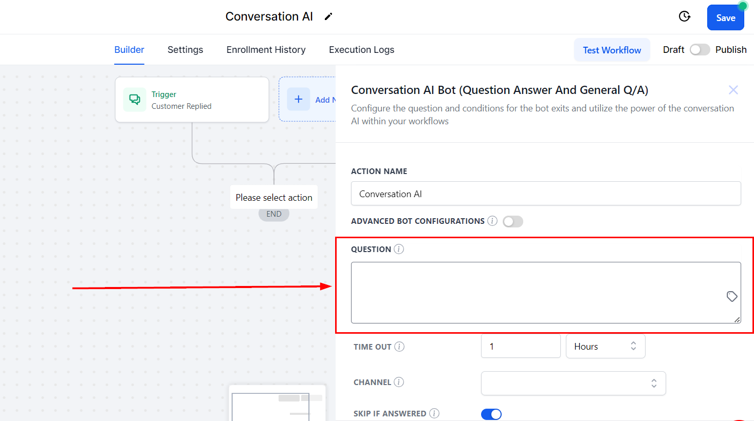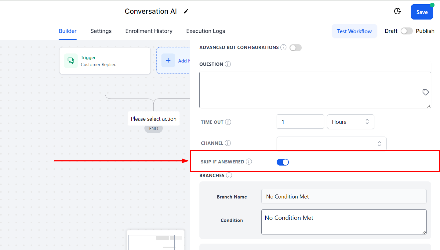Choose to skip asking a question if the answer already exists in the conversation history. Instead, the bot will bypass the question and direct the contact to the relevant branch or condition based on the existing response.