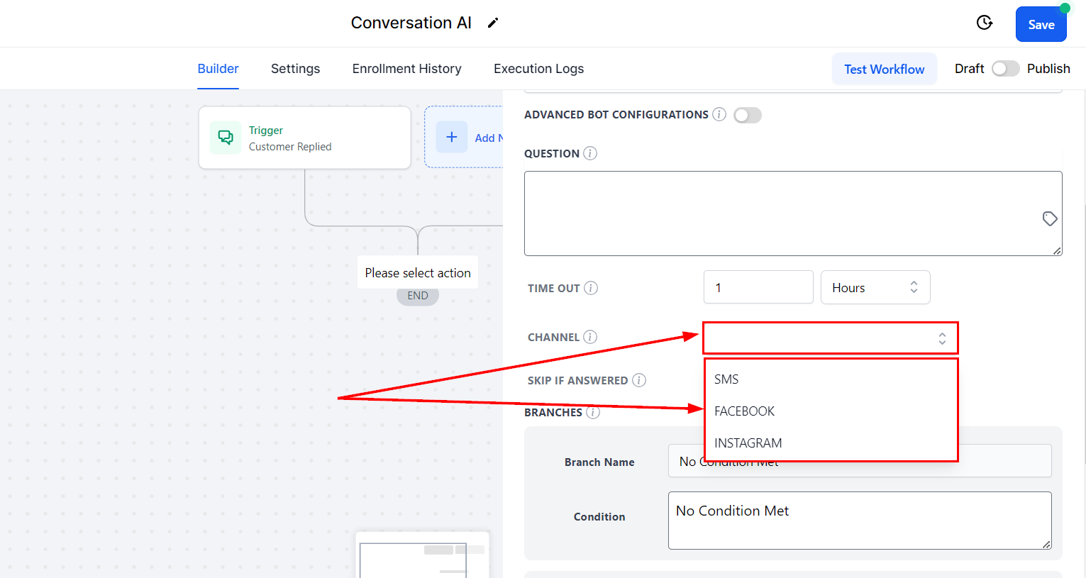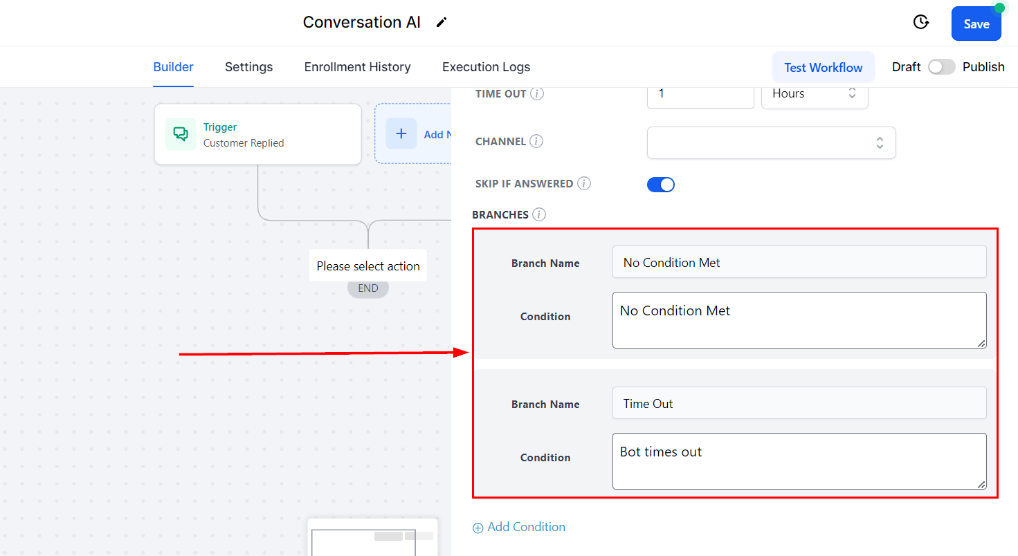 Conditional Branching: Design branches for conditional flow based on the contact's reply, allowing for tailored responses and actions.