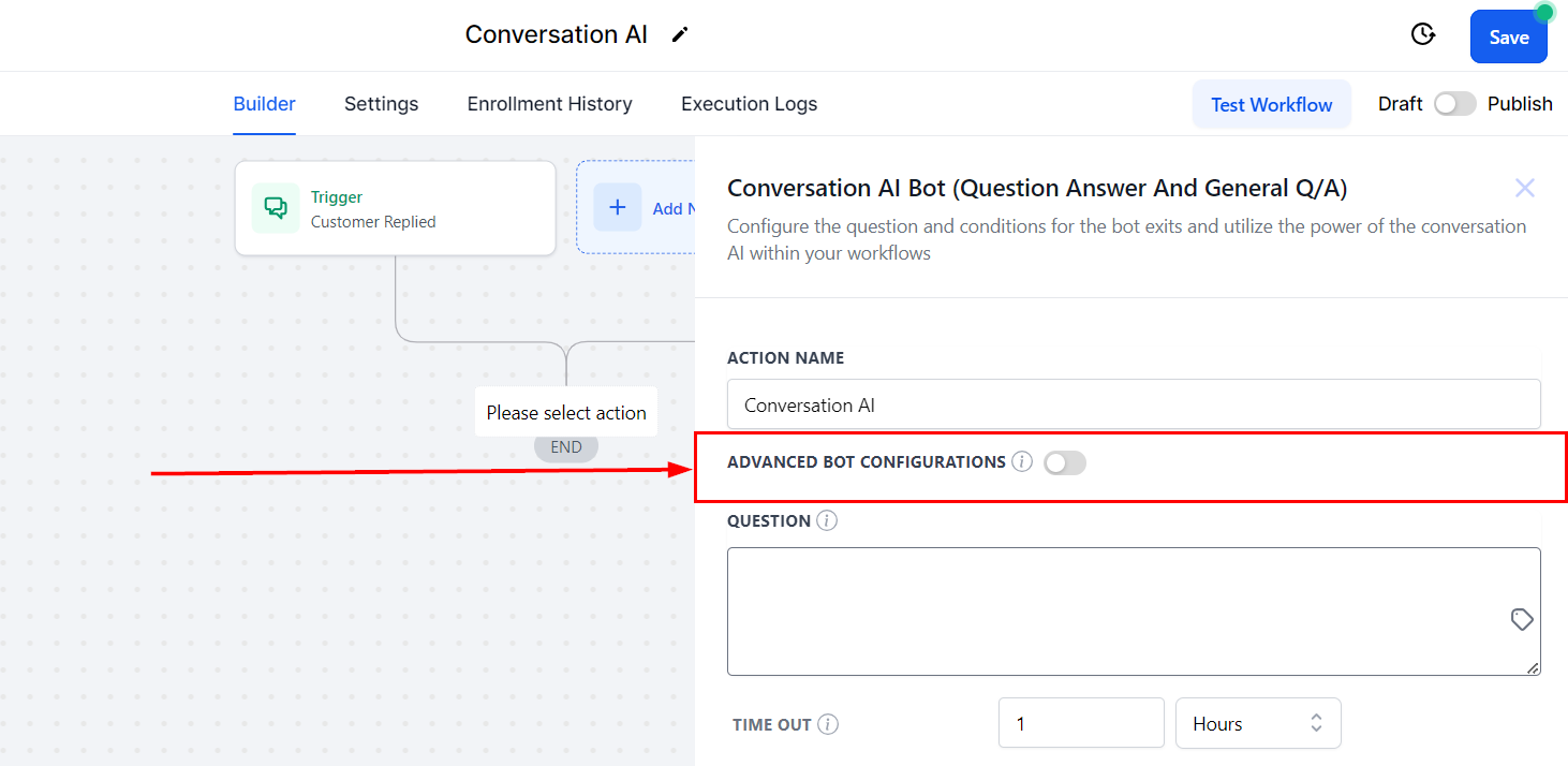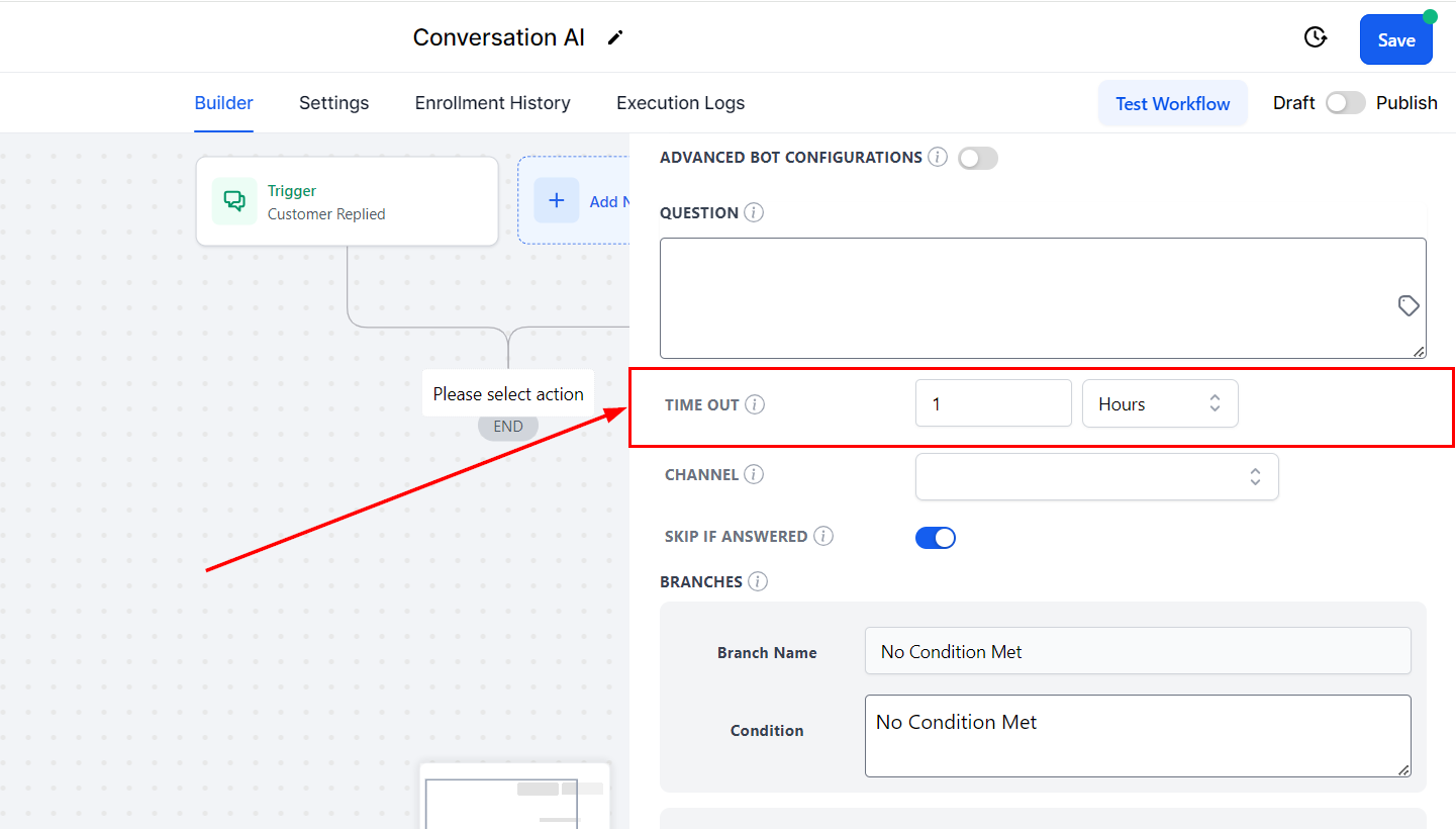 Specify the time frame in which the bot should wait for a response from the contact. When the contact fails to reply in the allotted time, the workflow automatically follows the Time Out branch, enabling you to implement follow-up actions or alternative steps to ensure continued engagement and effective workflow management.