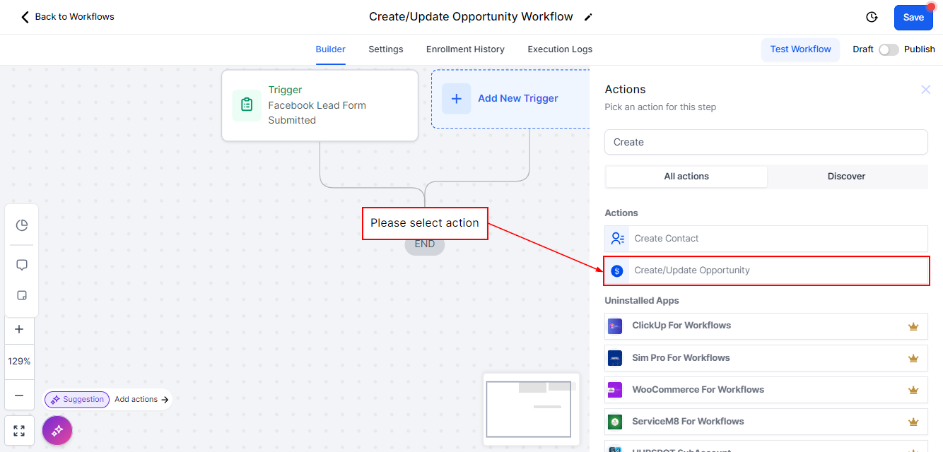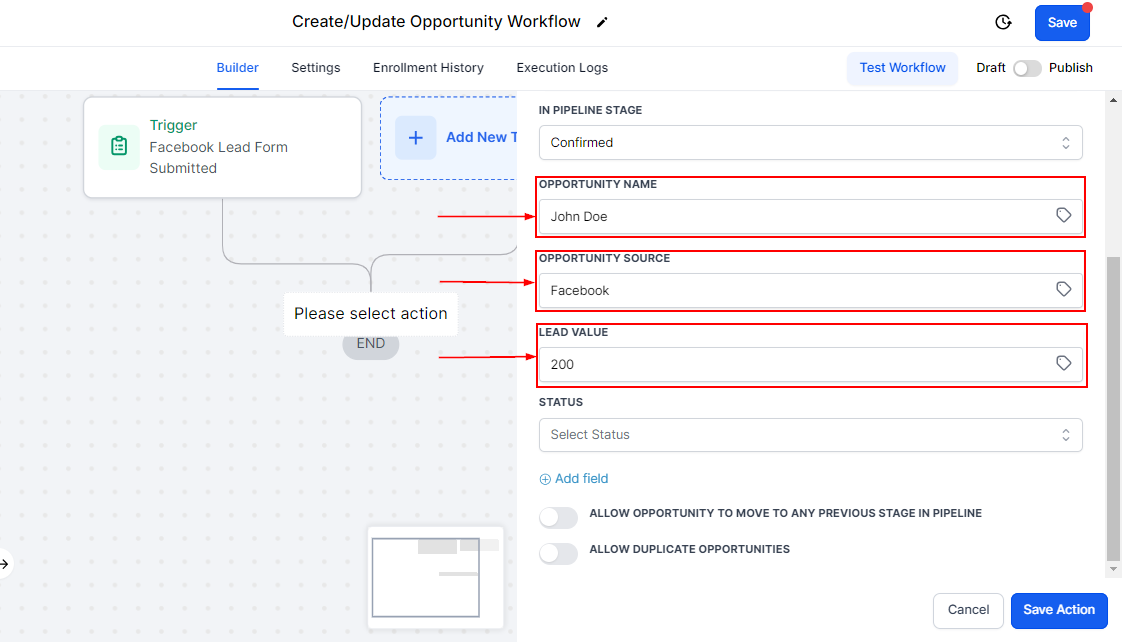 The Create/Update Opportunity workflow action simplifies and automates opportunity management, allowing you to track, update, and customize opportunities seamlessly. By using this feature, you can maintain an organized and efficient pipeline that adapts to your unique business processes.