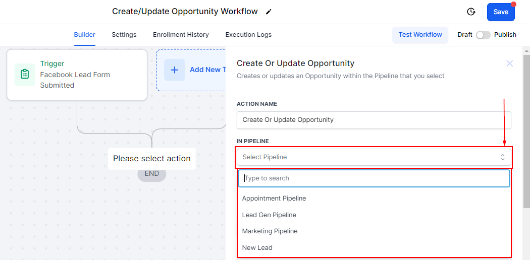 To use this workflow action, begin by selecting the pipeline where you want to create or update the contact’s opportunity.