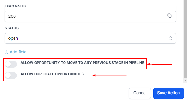 Allow Duplicate Opportunities: If your workflow involves a single contact needing multiple opportunities in the same pipeline, enable Allow Duplicate Opportunities. This ensures you can create or update multiple opportunities for the same contact without conflict.