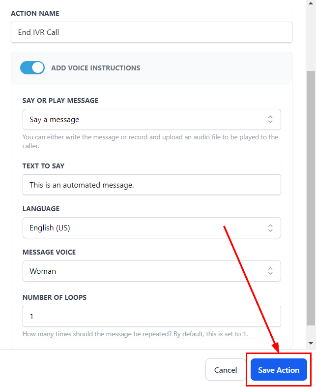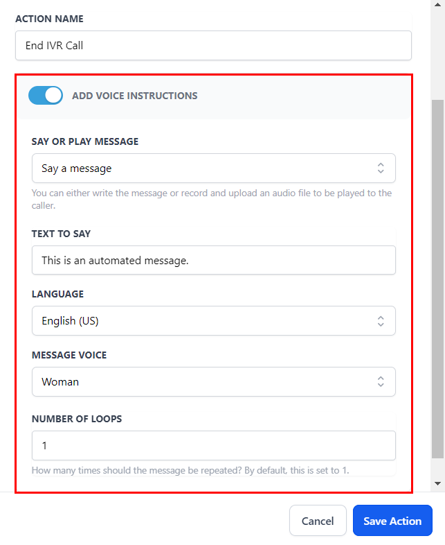 End Abruptly (Default): Terminate the IVR call instantly by saving the action with the “Add Voice Instructions” switch toggled off.