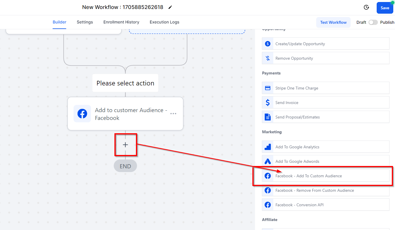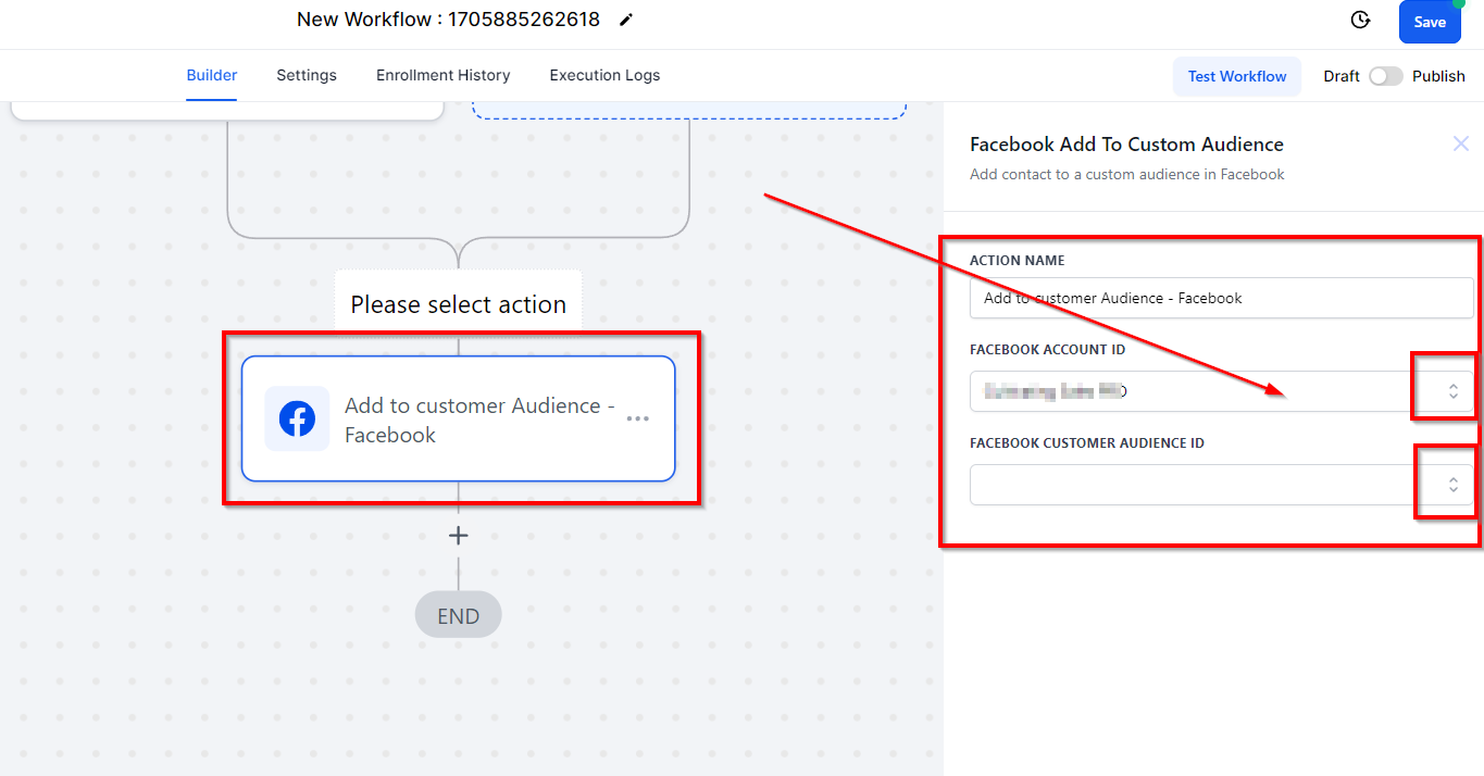Firstly, click on the designated + icon to add a new workflow action. From there, select Facebook - Add to Custom Audience. Next, choose the appropriate Facebook Account ID from the dropdown menu. Once the Facebook Account ID has been selected, the user can then choose the Facebook Customer Audience ID from the dropdown menu, where they want the contacts to be added.