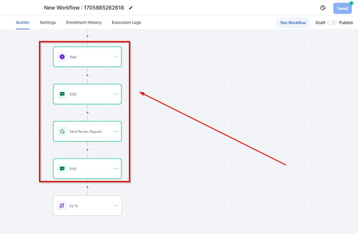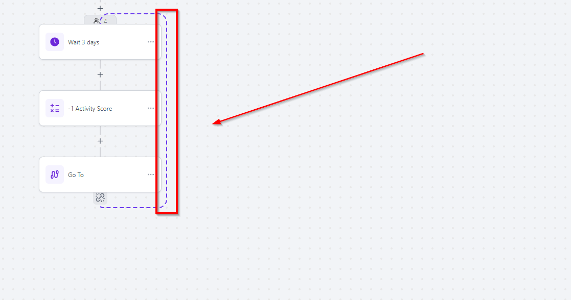 Once the dots are connected, the path is created, and contacts reaching the GoTo step will automatically shift to the target event connected by the dotted line. For example, contacts will go directly to the Remove Contact tag action upon reaching the GoTo step.