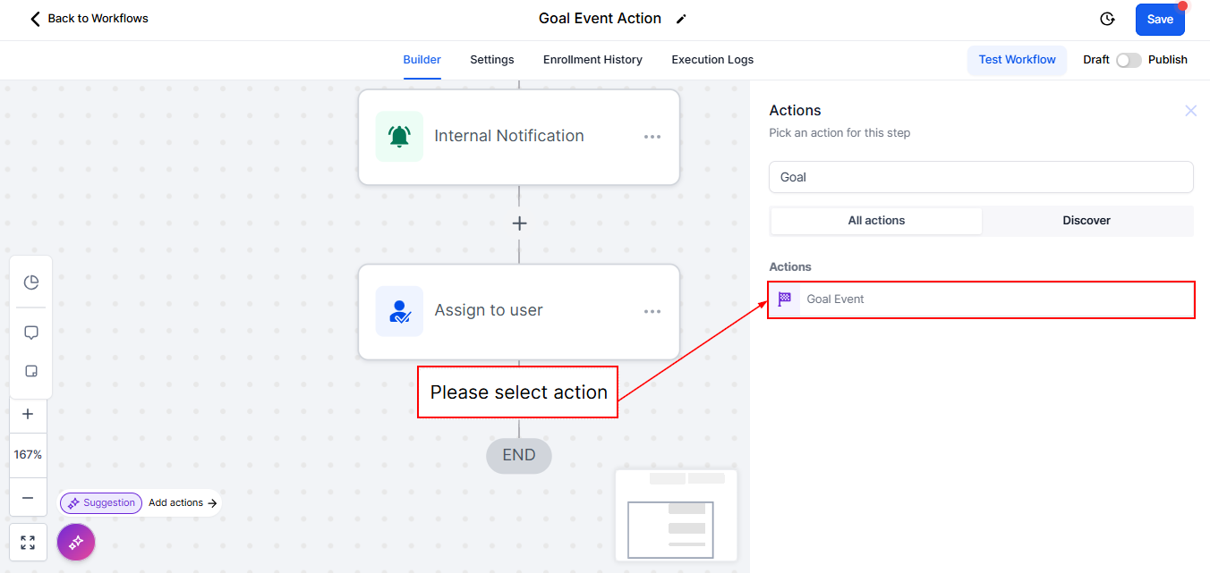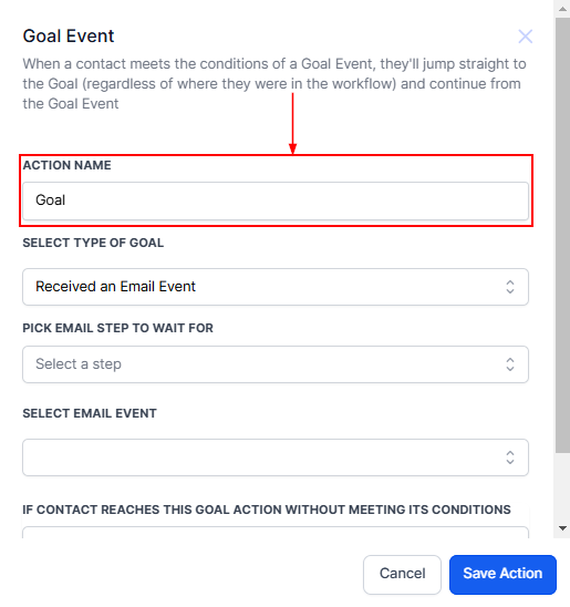 The Goal Event feature is a powerful action for streamlining workflows by intuitively advancing contacts based on specific conditions. Whether your objective is to track email interactions, link clicks, or other key actions, this feature ensures that your workflows are responsive and efficient. By customizing goal types, email events, and subsequent actions, you can tailor the system to align with your business needs.