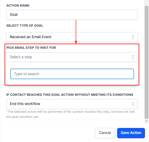 Goal Events can be chosen to establish a contact Goal for a workflow. Once a contact joins the workflow, the system starts monitoring the specified Goal Event to occur regardless of the current step of the contact.