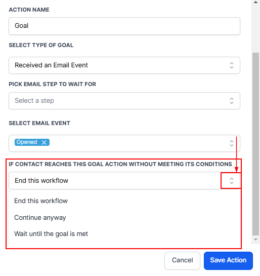 If the Goal event was not reached by the time the contact reaches the goal action in your automation, there will be 3 options to select from: