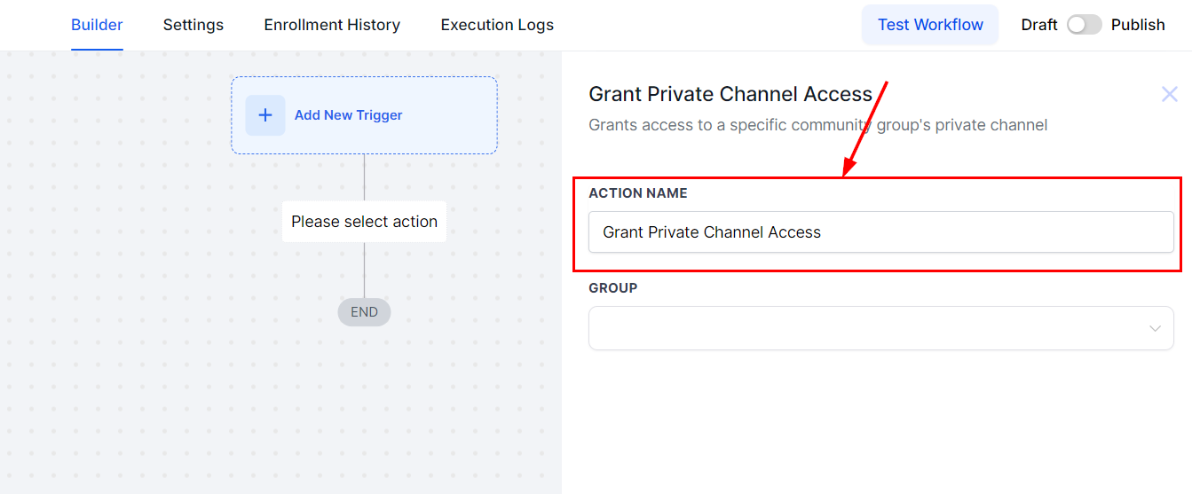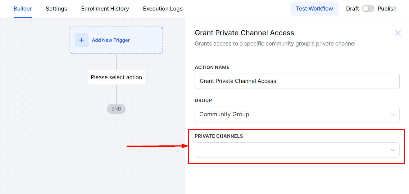 Finally, select the relevant Private channel from the dropdown. Choosing the correct Group and Private Channel is essential for the workflow to function as intended, as it ensures the actions are applied to the appropriate users gaining access to that particular private channel.