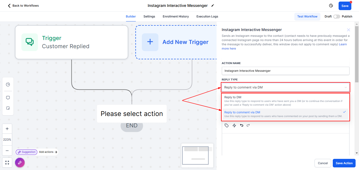 To begin, add a Trigger. For this example, we would be using the Customer Replied trigger, once that is done, and select the Instagram Interactive Messenger Action.