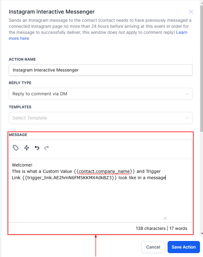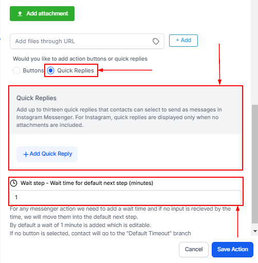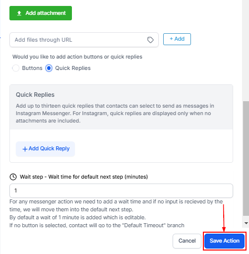 Once your message, attachments, templates, and Quick Replies are configured, click Save Action to complete the setup. Your Instagram Interactive Messenger action is now ready to engage customers effectively.