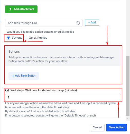 Add up to three action buttons to messages, like opening a URL or triggering a workflow step, by clicking + Add New Button and defining their functions; for the Wait Step, set a customizable wait period (default 1 minute) to allow customer responses, with the workflow automatically proceeding via the "Default Timeout" branch if no input is received.
