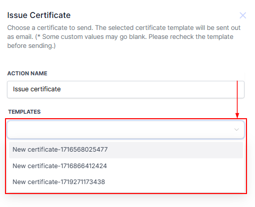 Once selected you will be prompted to choose from your Certificate Templates for the one you will be sending out. Remember that if the contact who triggered the workflow doesn't have fields used by the template a blank space will replace them.
