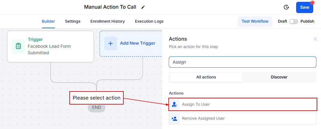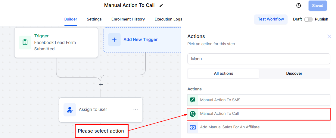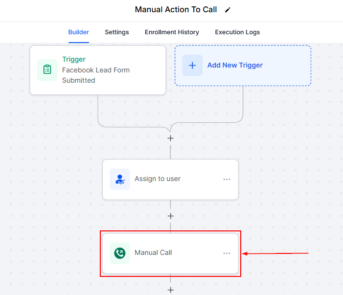 Adding Manual Action to Call into your workflows ensures timely communication with your contacts. Assign tasks, customize and add more actions that suit the purpose of the workflow, and save your workflow to keep everything running smoothly while staying adaptable to your teamβs needs.
