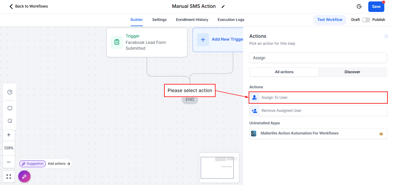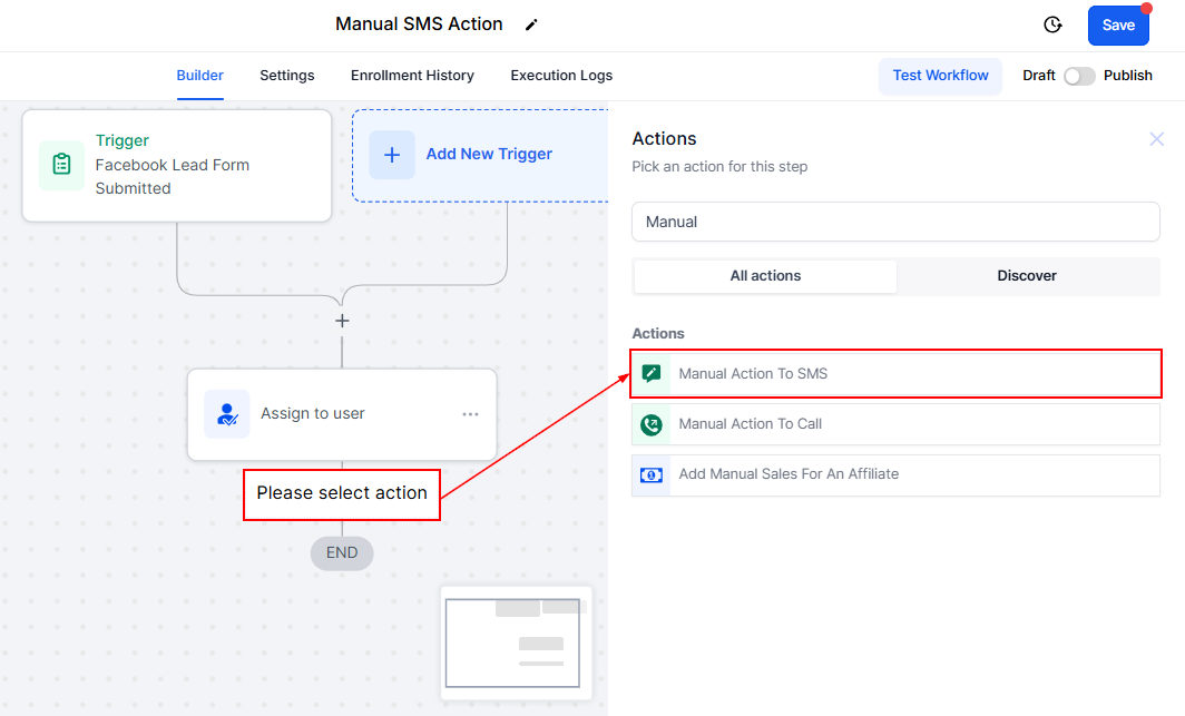Once added to your workflow, your manual actions will look like this and you can select the Manual SMS and edit it as and when you need. You can also add more steps. Publish and Save to activate the workflow