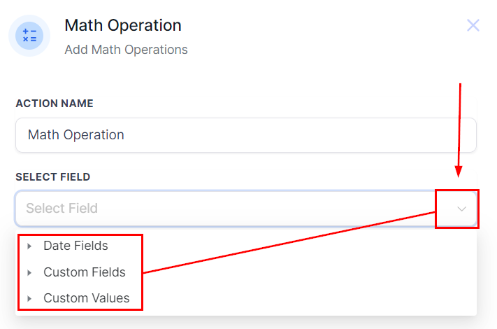 Select the field you want to apply the Math Operation on, this can be any numeric field in the system including dates and custom values.