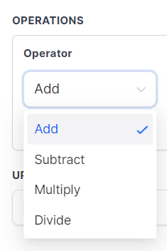 For Numerics fields you can Add, Subtract, Multiply, or Divide as well as add multiple operations for the system to run.