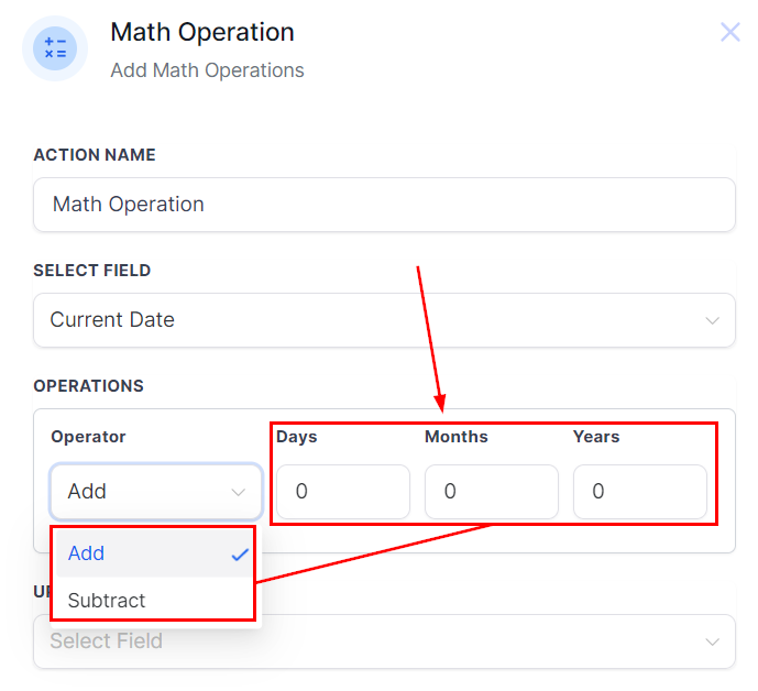 For date fields, the operations will be limited to Adding or Subtracting, once the operator is selected enter the total days, months, and/or years.