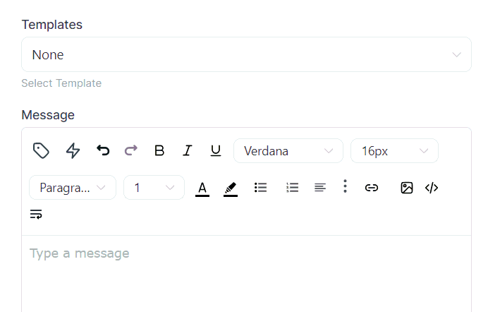 If you are not using an email template, you can type the body of the message in the message box. You have a variety of text edit options available to customize your email including typography, alignment, bullet points, and adding images.