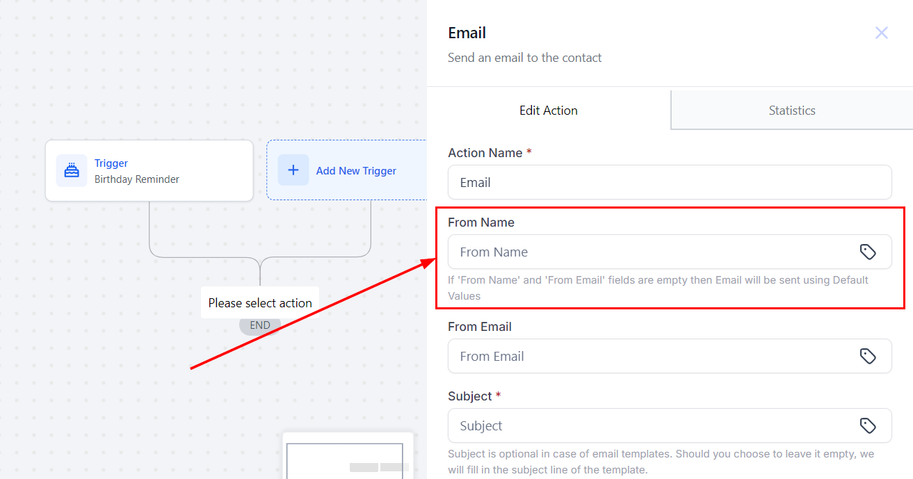 In the From Name field, you should enter the sender's name. You can also click on the tag icon to use the custom values.