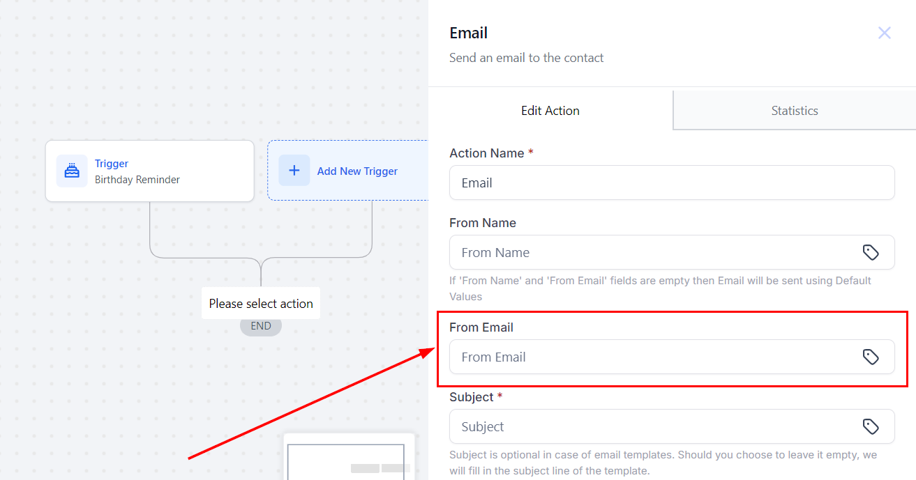 In the From Email field, you should enter the sender's email. You can also click on the tag icon to use the custom values.