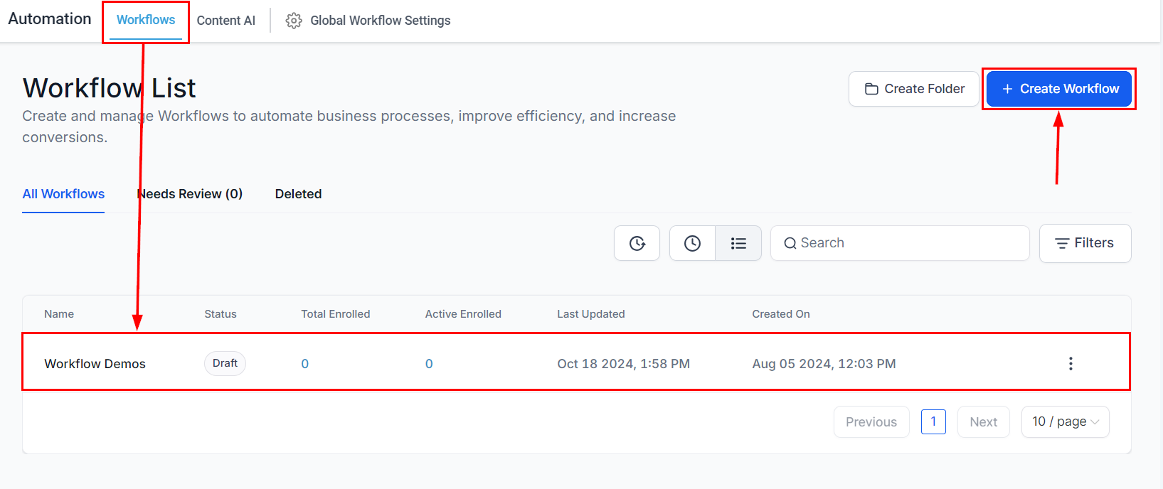 To add this action to your workflows, go to the Automation tab and select Workflows in your account. From there, either choose an existing workflow or create a new one.