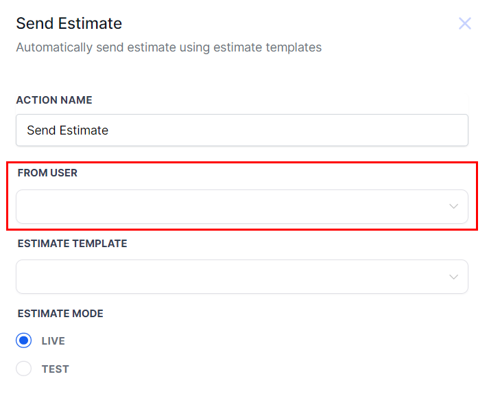 From the User dropdown, select the individual designated to send the estimate. This ensures that the appropriate team member is accountable for the communication, allowing for a more personalized touch in the interaction with the customer.