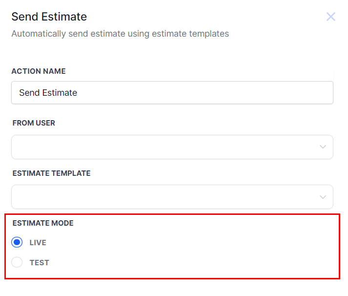 Choose Live for actual estimates or Test for trials within the Estimate Mode field.