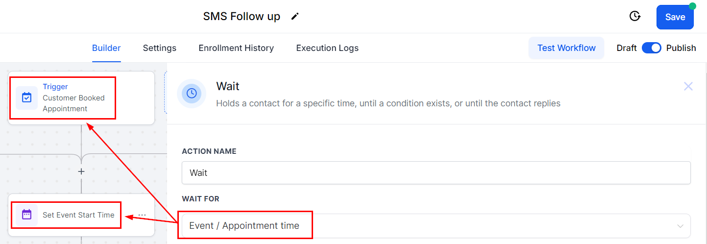 This allows you to make the workflow send the messages in a determinate amount of time concerning an event or appointment, for example, one day before an appointment. When setting a Wait step for an event add the action Set Event Start Date first. Set the time you want the contact to move forward in the workflow.
