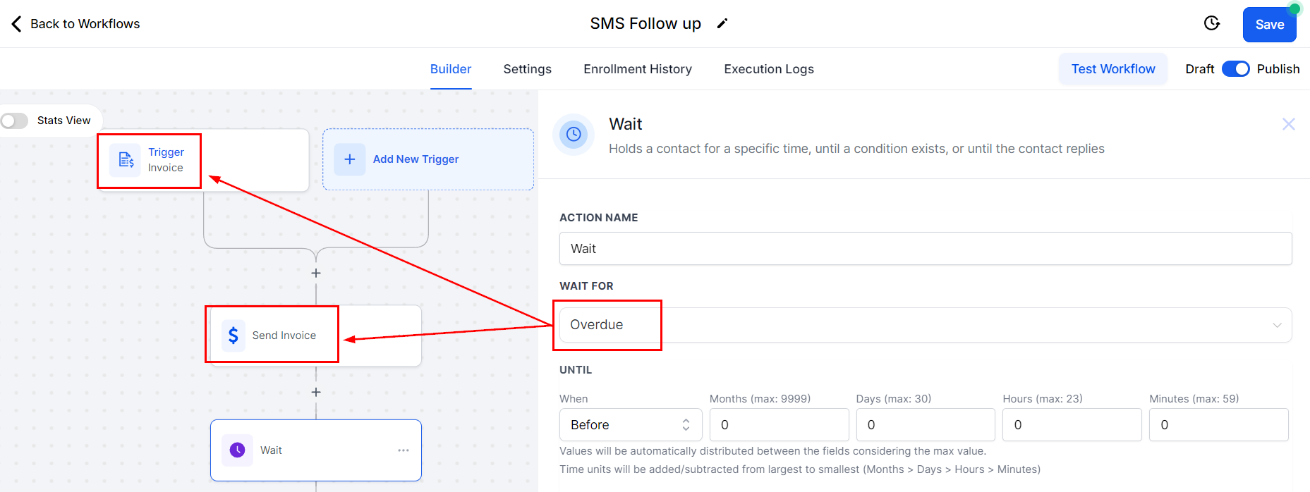 This feature enables you to schedule messages to be sent a specific amount of time after an invoiceβs payment date. When configuring this Wait step, ensure that you have included a trigger or action that guarantees the contacts receive the invoice; otherwise, they may get stuck at this step.