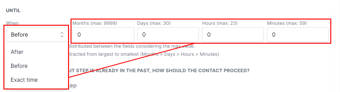 Select when you want the next step to happen. Here you can choose between before, after, or an exact time concerning the event.