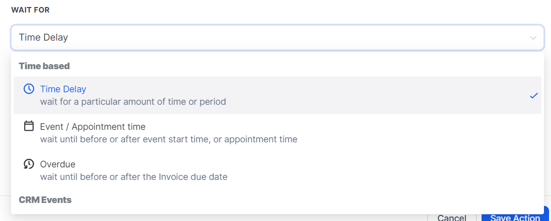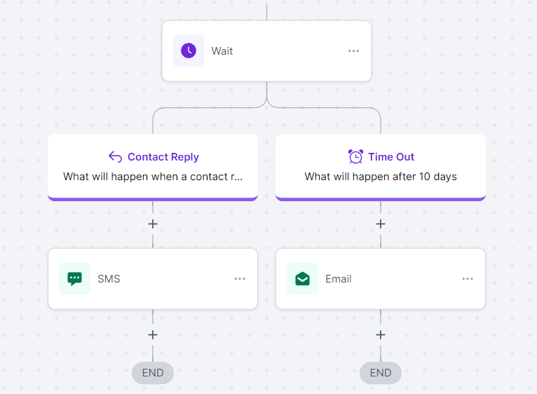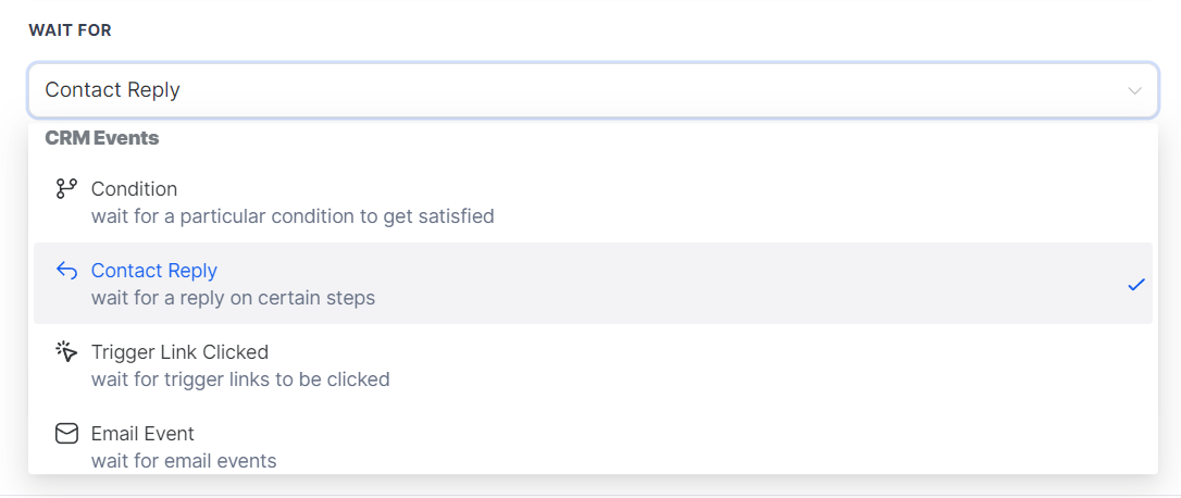Wait is a unique type of workflow action designed to pause the contact at a specific step in the workflow until a desired condition is met. This useful tool is handy when waiting for a certain time, contact reply, or event that needs to be completed before moving the contact forward in the workflow.