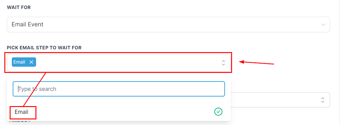 This option will keep the contact in the wait step until a contact interacts a certain way with a previously sent email. To use it first select the Email Step you want the contact to interact with.