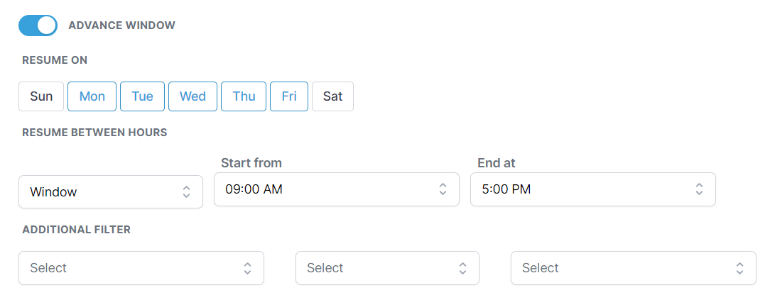 If you'd like to limit the days or hours in which the contact will advance enable Advance Window.